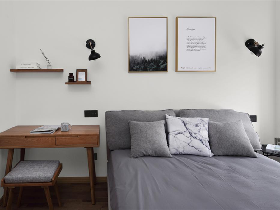 主臥就用低調內斂的灰色,搭配胡桃木的小書桌。因為業主的需求是寬敞,簡潔。所以就舍去了床頭柜,改成在一側放置一個小書桌,可以作為一個簡單的辦公區域。平時坐在這里,安靜的看看書都可以。