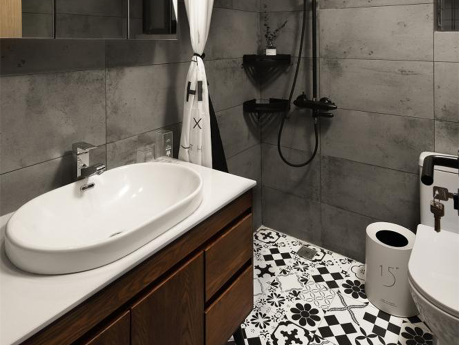 用浴簾做干濕分離,把洗手池與淋浴房很好的隔離開來。座椅在細節上做到了特別和精致,整體顏色以灰色水泥為主搭配花色地磚。讓整體空間變得豐盈起來,設計感十足且實用性高。