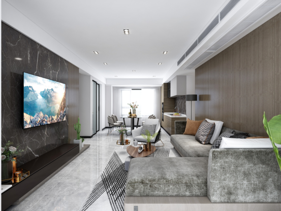 客廳電視墻以優雅的咖啡色大理石為背景墻,壁掛上電視機,還有落地式的電視柜設計,呈現出大方端莊的視覺氛圍感。