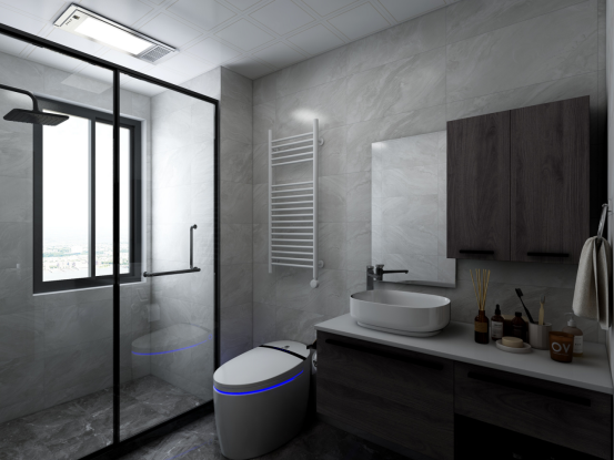 衛生間黑色拉絲不銹鋼淋浴房邊框為整體效果增加了現代感,而天然的木色調清爽自然。