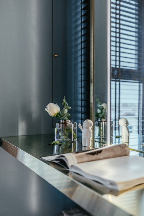 自由從來不是某種形式的產物。客廳與臥室共享,用鐵藝黑框玻璃門輕巧地將這兩個空間分開,百褶窗簾稍加遮擋,藉由開闔變化引發空間邊界模糊效應,探索無限延展的可能性。